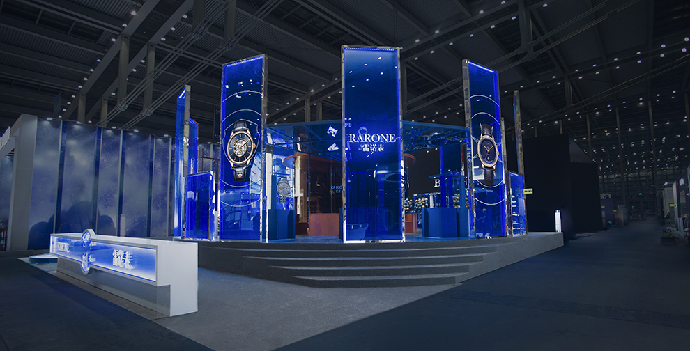 本次鐘表展,雷諾表突破以往封閉式的空間設計,以全新的垂立藍色通透亞克力作為展廳的主要裝飾,使得整個展廳充滿通透感又充極具科技特質。展廳設計為圓形,與腕表表盤的形狀相呼應,整個展廳展臺以腕表中一到十二的羅馬數字形式呈現。令觀展者仿佛置身于表盤之中,體驗奇妙的空間感,穿梭于時空之中。