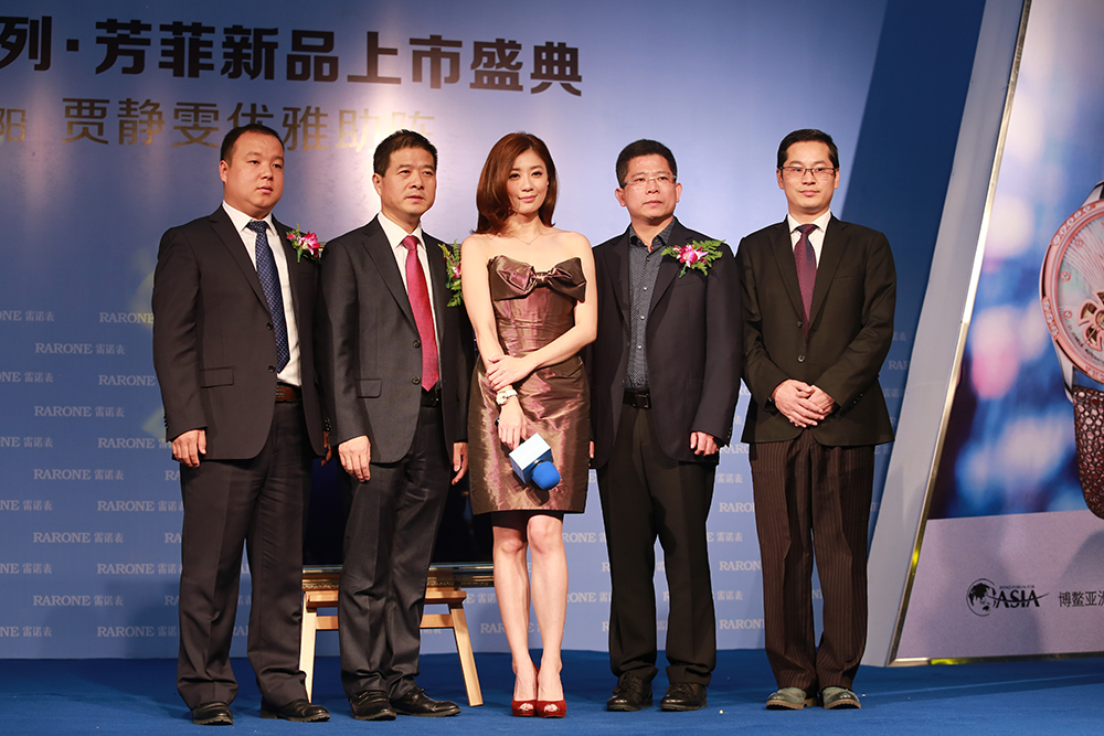 雷諾表總經(jīng)理詹江洲先生(左三)、沈陽興隆大家庭購物中心總經(jīng)理肖紅濤(左一)雷諾表遼寧總代曾昌民先生(右二)、雷諾表營銷總監(jiān)程兵先生(右一)與賈靜雯女士一起為新品上市揭幕